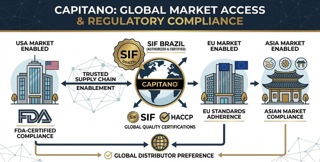 A Truly Global Presence Capitano’s robust logistical infrastructure allows us to operate smoothly and securely across major global economic blocs. Our operational efficiency is built on an absolute mastery of customs procedures, shipping documentation (Incoterms), and the careful coordination of refrigerated sea and air freight.